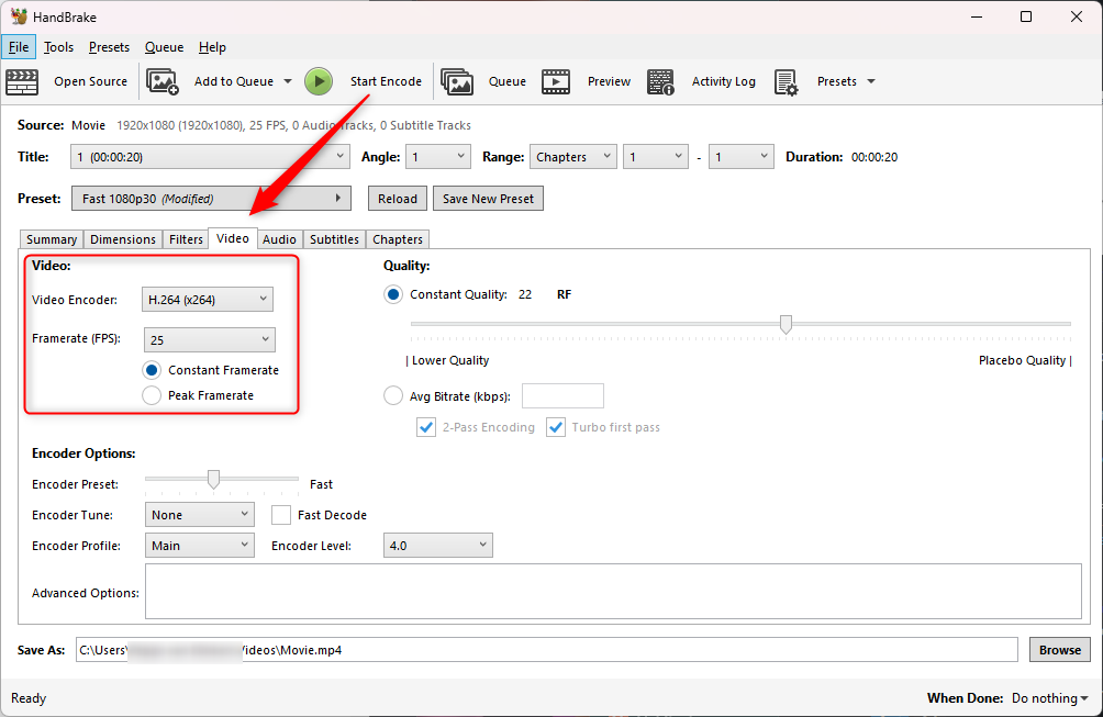 - En la pestaña "Video", recomendamos utilizar 30 FPS con la opción "Framerate constante", como se muestra en la captura de pantalla a continuación.