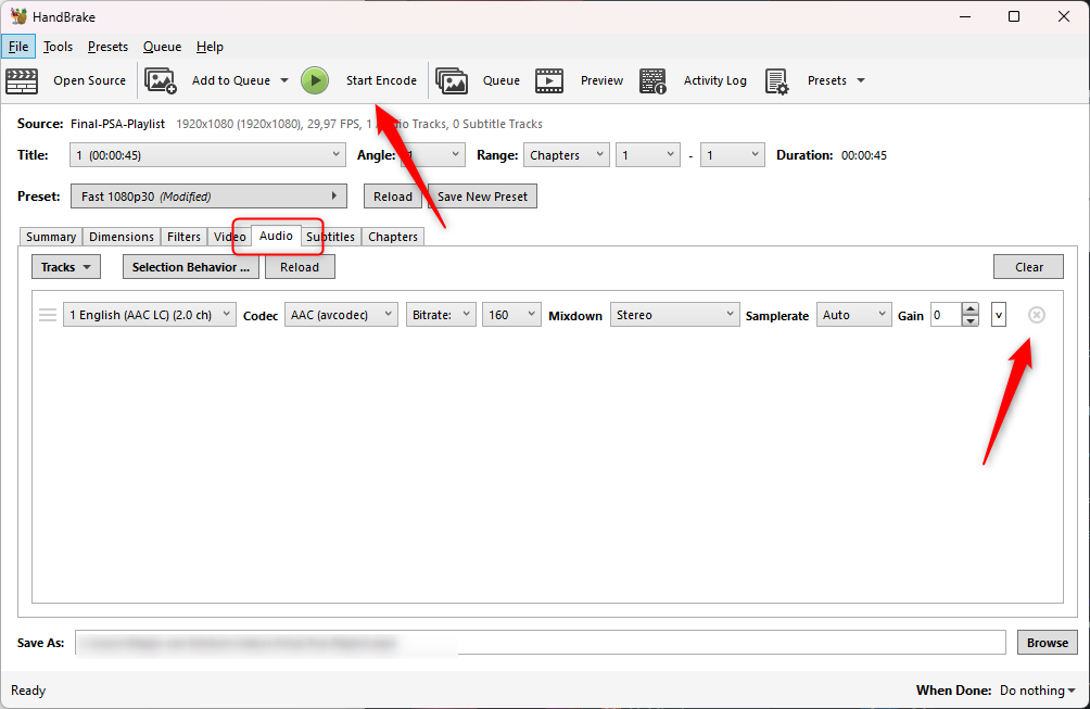 - Si no necesitas el audio del archivo, puedes eliminarlo en la pestaña "Audio" y hacer clic en "Iniciar codificación".